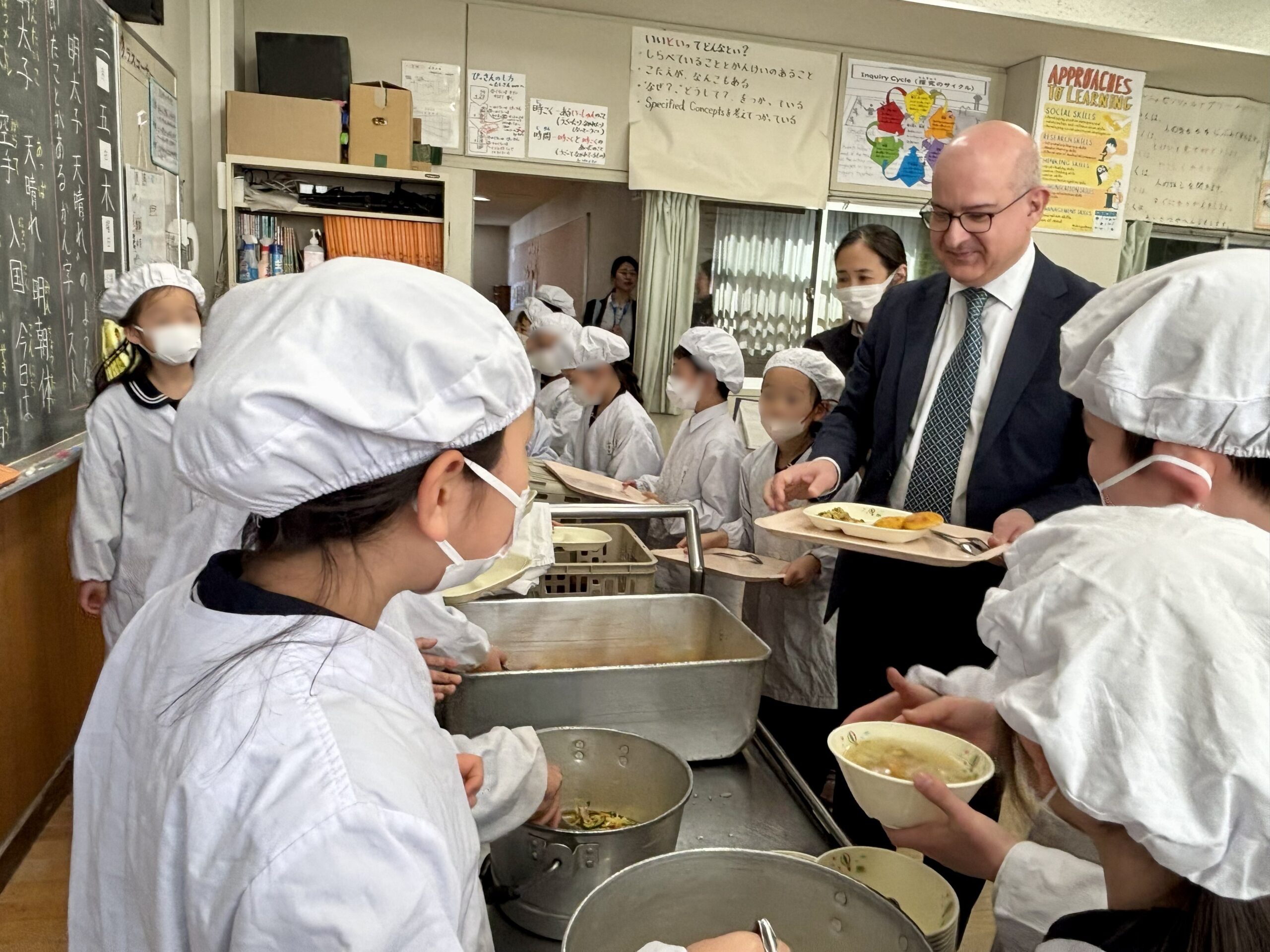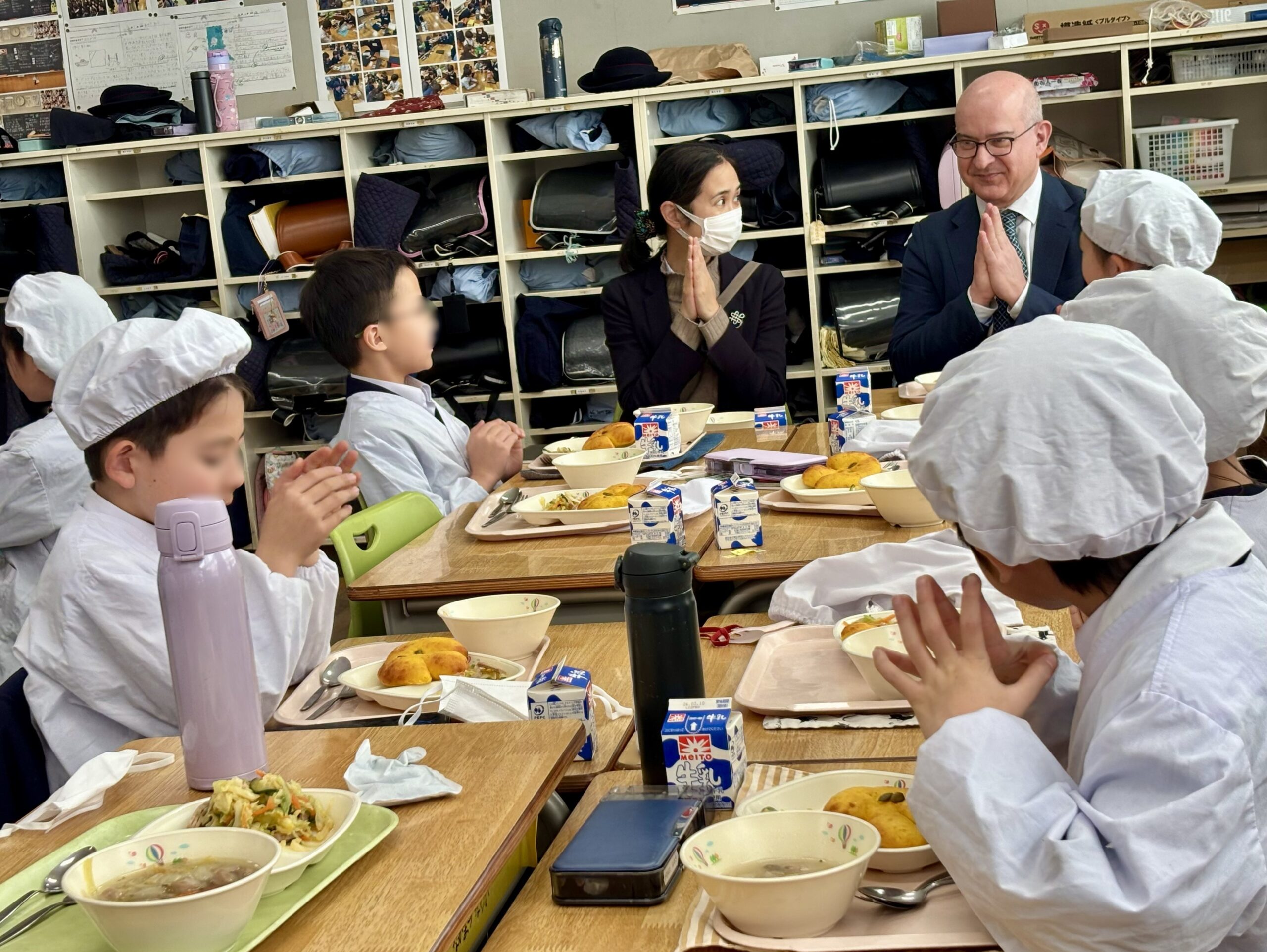 その後、2年生とともに給食を体験しました。日本の学校では児童自身が給食の配膳や後片付けを行います。また、食に関する知識と「食」を選択する力を養うとともに、食材の生産や調理に関わる方々、いただく命に感謝することを学ぶ食育が行われています。サンティアゴ課長も実際に配膳や片付けを体験するとともに栄養教諭に安全性を確保しながら児童の健康を支える学校給食の仕組みについて説明を受け、「給食は日本に大変特徴的な教育活動である」との感想を述べられました。