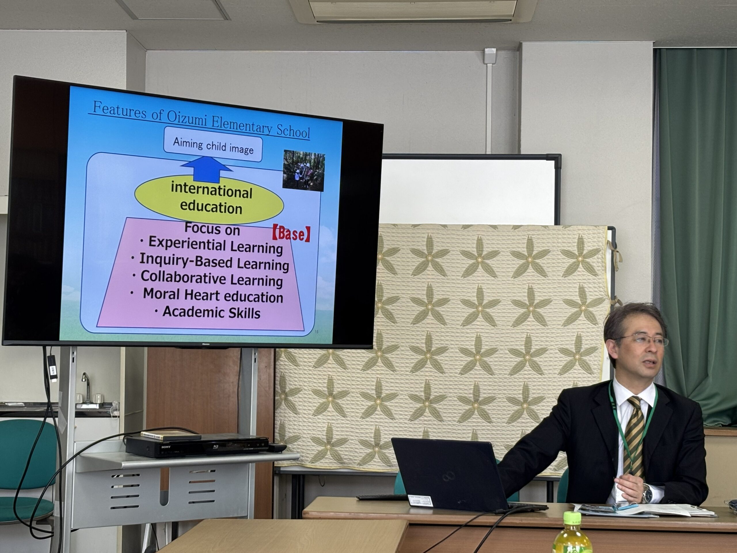学校到着後、青山直志校長と細井宏一副校長から学校の概要について説明を受けました。1938年に開校した同校は、国際バカロレア(IB)ワールドスクール(注1)及びユネスコスクール(注2)として認定されており、「体験的な学び・探究の学び・協働的な学び」と「心の教育・行事の充実」「確かな学力」を基盤として国際教育を推進しています。運動会や音楽会、臨海学校などの学校行事のほか、全校児童が一人一鉢の菊を栽培したり、5年生が自作のわらじを履いて箱根旧街道の石畳を歩く体験学習を行ったり、縦割り異学年グループ(生活団)での活動などを通じて、児童の主体性や協働性、社会性を育む教育を実践していることが紹介されました。