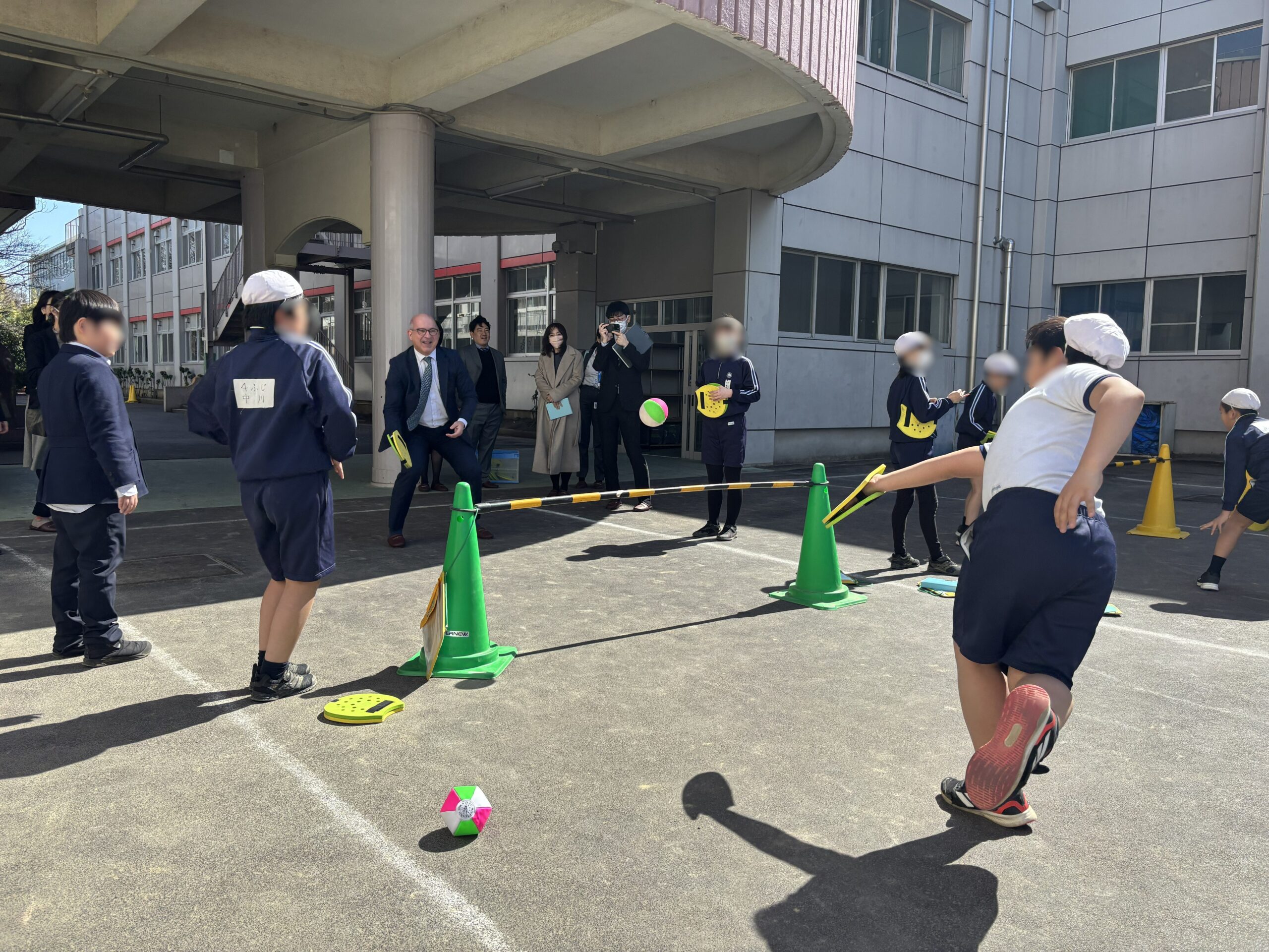 学校概要の説明後には、授業や校内の様子を視察しました。2年生の音楽(合唱や鍵盤ハーモニカ)や5年生の家庭科(食育)の授業を見学したほか、3年生の理科の授業では児童との会話を通じて、5年生の体育の授業では「テニピン(注3)」の体験を通じて、日本の学校教育が「知・徳・体」をバランスよく育むことを目指していることについて理解を深めました。