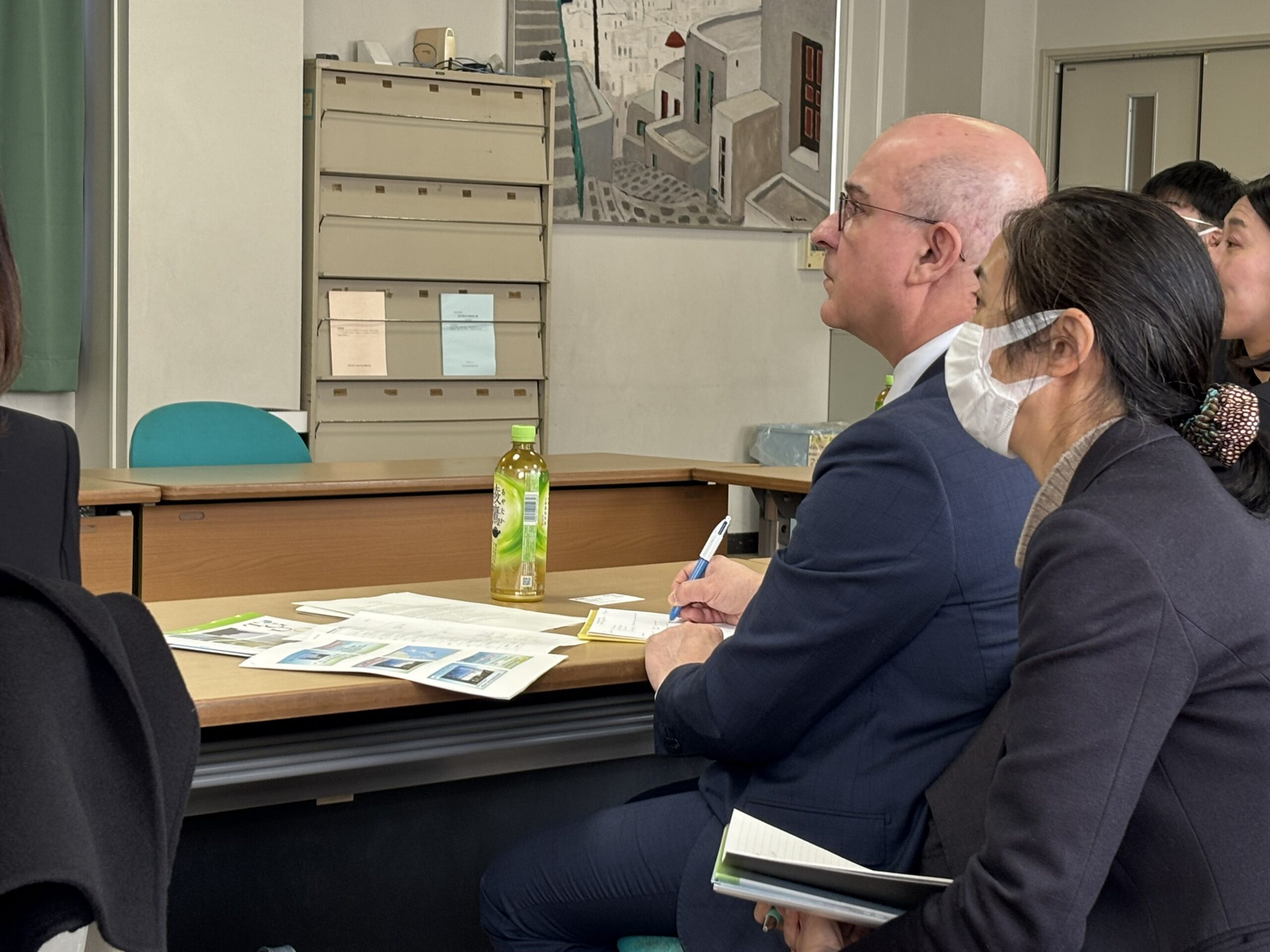 学校の概要説明を聞くサンティアゴ課長