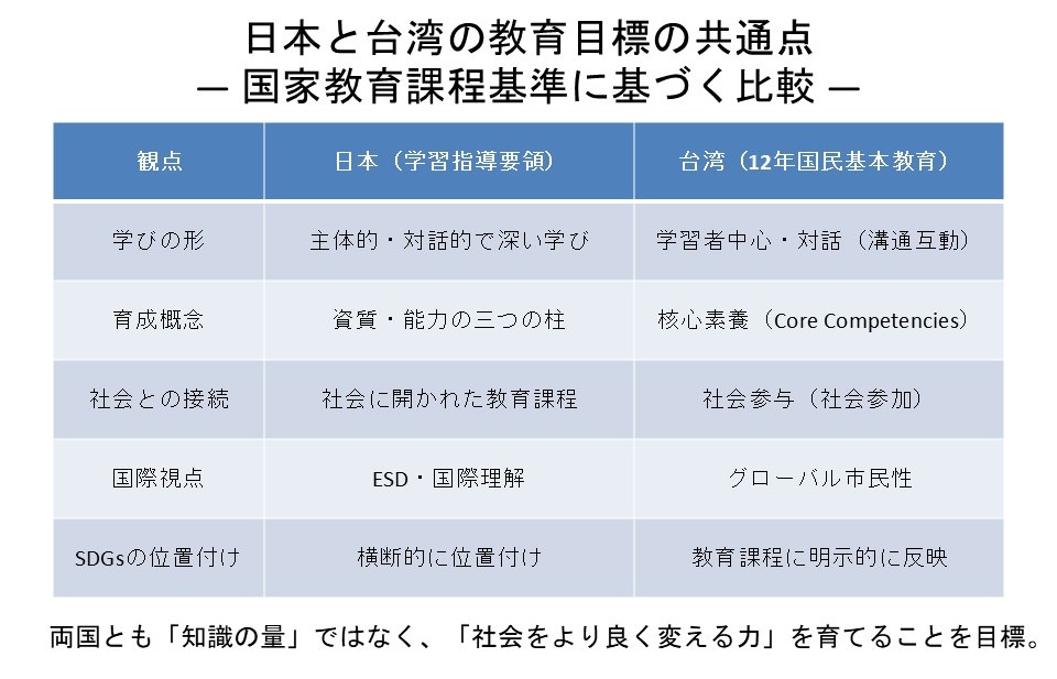 上図のように、日本の学習指導要領と台湾の十二年国民基本教育課程は、ともに「主体的・対話的で深い学び」「探究」「社会参画」「持続可能な社会の担い手の育成」を重視しており、教育目標には高い共通性があります。本事業では、こうした共通基盤を踏まえ、年間指導計画や単元目標を教員同士が共同で設計し、生徒の学びの変容を共有・検証する実践研究型の国際協働を行ってきました。