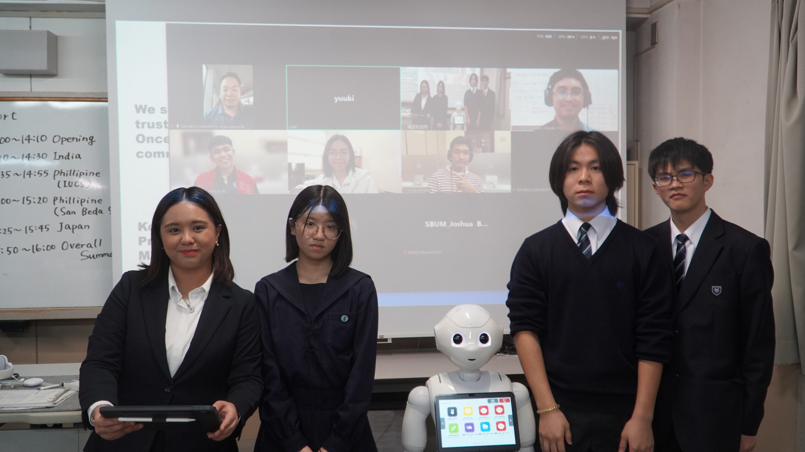 フィリピン側は、対話性の高いエンターテインメント型プログラムを提示し、本校は英語による学校案内を行う対話型プログラムを発表した。音声認識の精度といった課題に対しては、表現の整理やプログラム構成の工夫により対応したことを報告した。