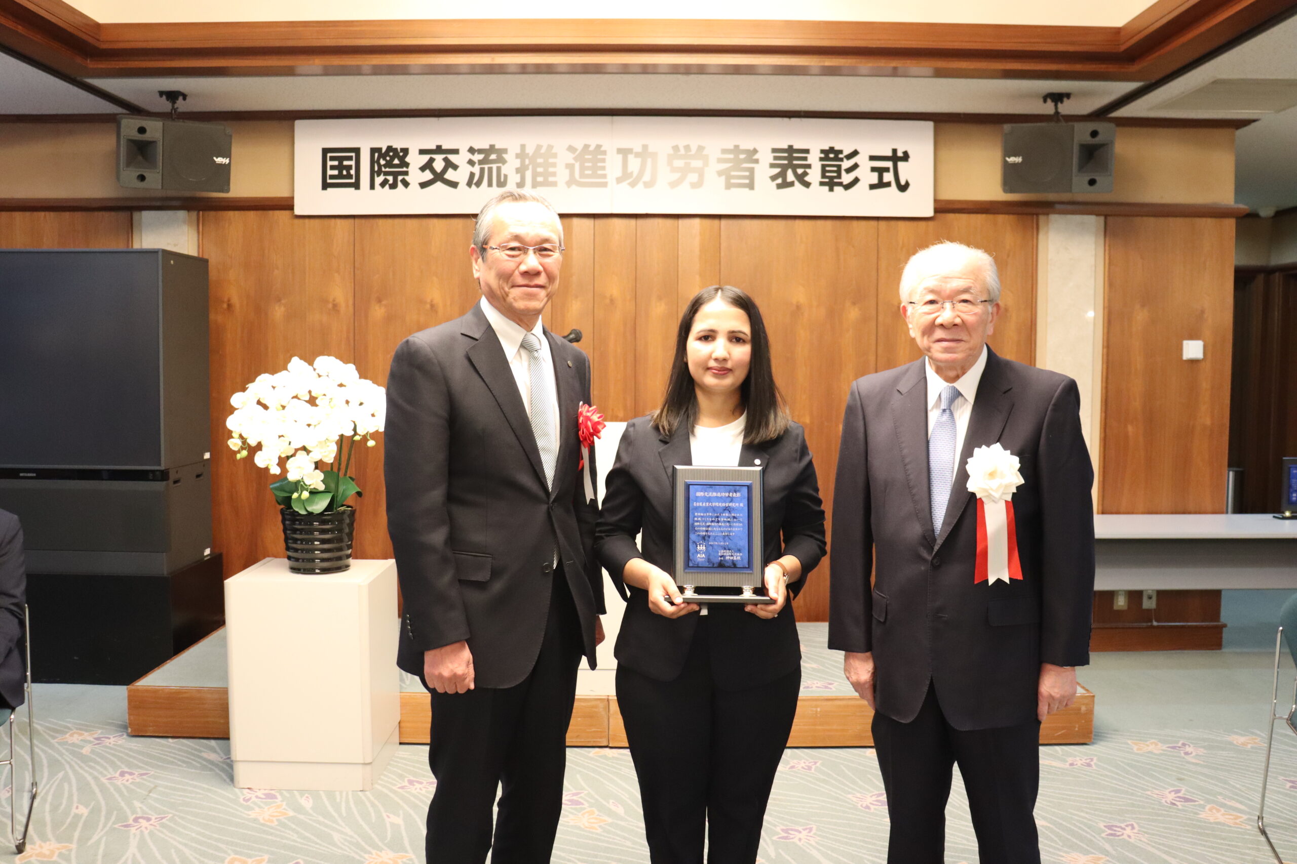令和7年11月12日にあいち国際プラザで開催された表彰式には、環境経営研究所長の伊藤雅一教授と、ネパールでの学習支援に参画している大学院博士後期課程の学生代表が出席し、愛知県国際交流協会の神田真秋会長より表彰盾が贈られました。