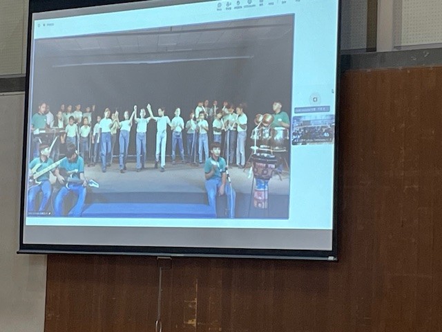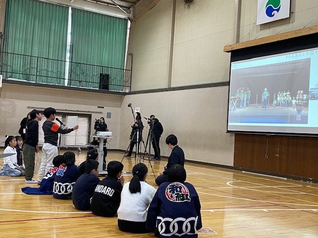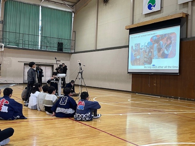 令和8年1月20日のオンライン音楽交流会当日の午後、城北小学校の体育館では5年生児童約60人が、インドとつながった大画面(スクリーン)の前に集まりました。ヤマハのスクールプロジェクトのスタッフは日印両方の学校で運営に協力、DCISの教室に集まった同校の1、2、5年生30人がスクリーンに登場し、両校の児童による開会の挨拶から、音楽交流会が始まりました。